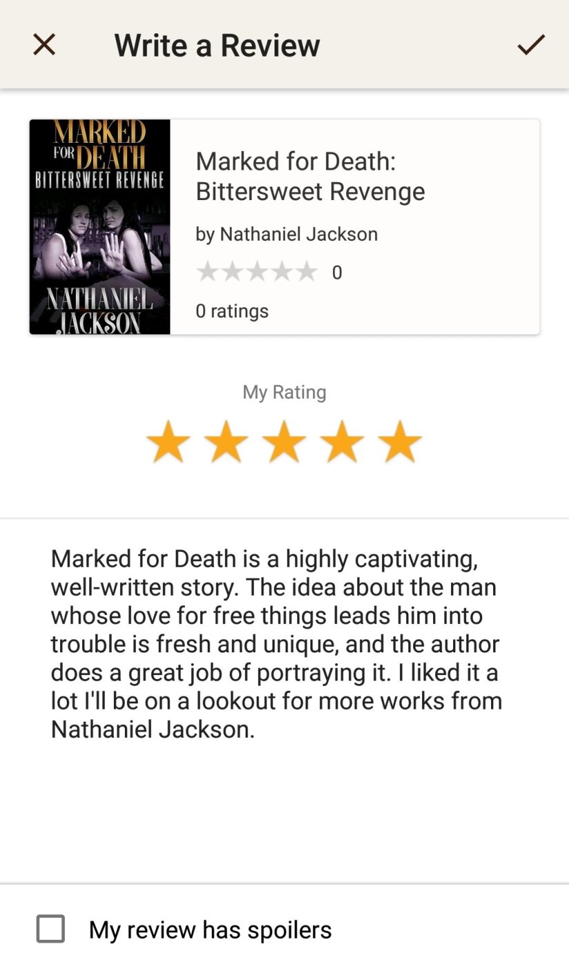 Purchased my Book. January 7, 2019January 7, 2019 nathanieljackson999 Share this: Share on X (Opens in new window) X Share on Facebook (Opens in new window) Facebook Like Loading... Related Published by nathanieljackson999 Married with four children. I reside in Chicago Illinois. I am the Author of Marked for Death, Bittersweet Revenge. View all posts by nathanieljackson999
